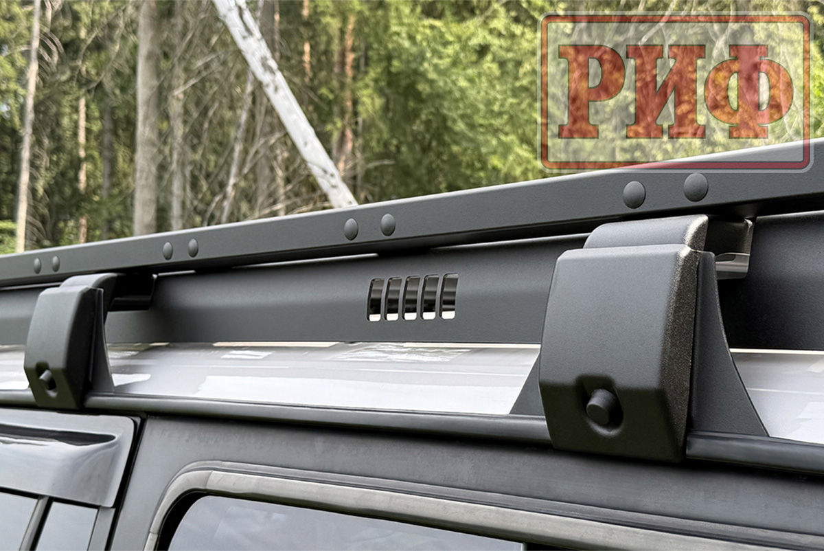 Алюминиевый багажник РИФ – это не просто платформа, на которую можно что-то положить, и притянуть подручными средствами к поперечинам, а полноценная система для крепления не только различных по форме и весу грузов, но и многочисленного дополнительного оборудования и инвентаря. В поперечинах, на всю их длину, есть пазы в которые заводятся крепежные болты кронштейнов или кольца для стяжных крепежных ремней. Таким образом точку крепления можно организовать в любом месте платформы. Толщина стенки паза, в который входит болт крепления, - 3 мм, что позволяет ему держать нагрузку на разрыв до 200 кг! Пазы закрыты специальными упругими пластиковыми защитными лентами, имеющими объемную полусферическую форму. Благодаря этому, груз, размещаемый на платформе, не контактирует с собственно алюминием, а лежит на этих лентах. Таким образом, не царапается порошковая краска багажника и сам груз. Также ленты препятствуют попаданию грязи, мусора и воды в пазы.