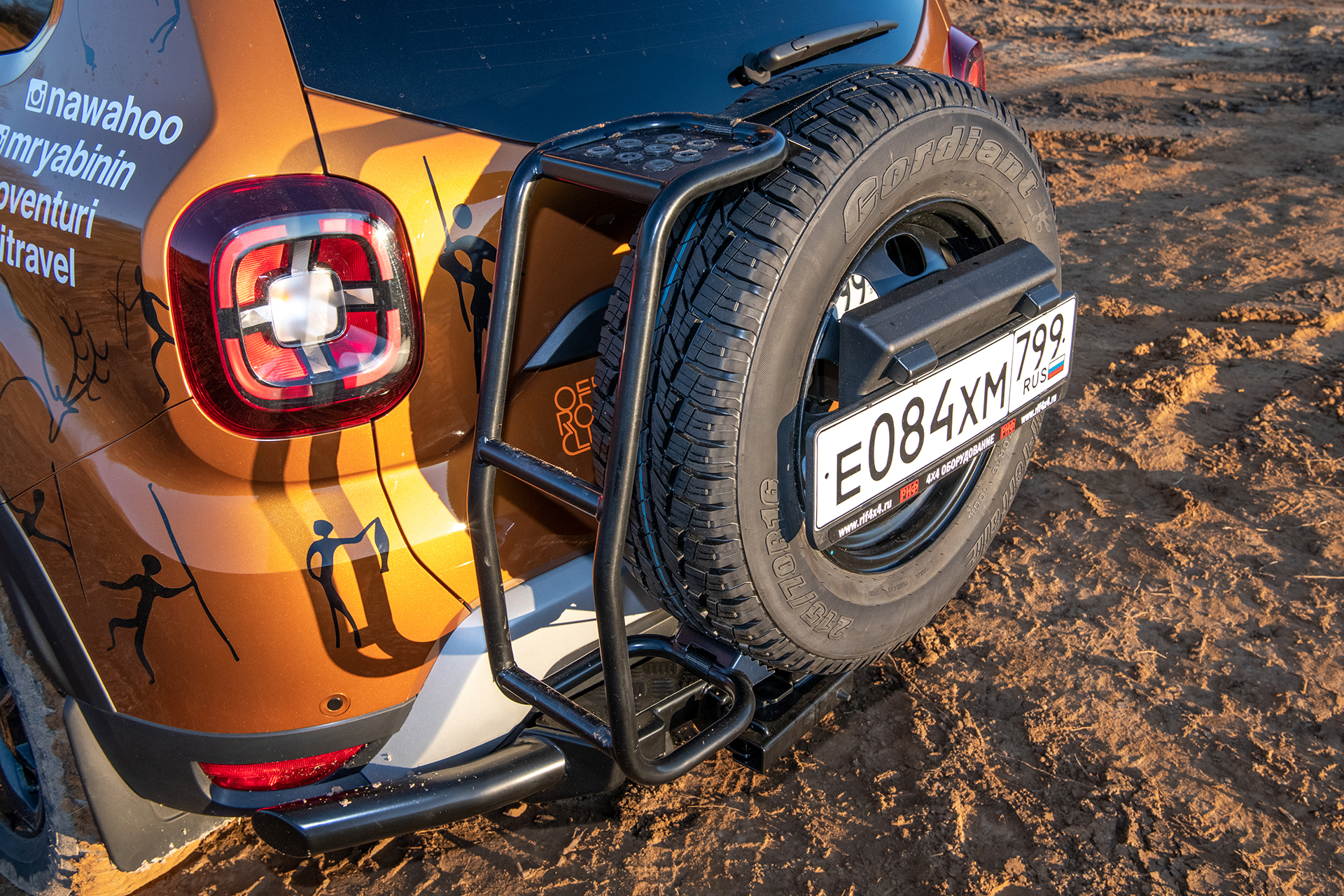 Отличительной особенностью новой лестницы является ее универсальность. Лестницу можно установить на колеса, практически, любого размера, начиная от штатного запасного колеса Renault Duster и заканчивая шинами диаметром 36-38 дюймов.