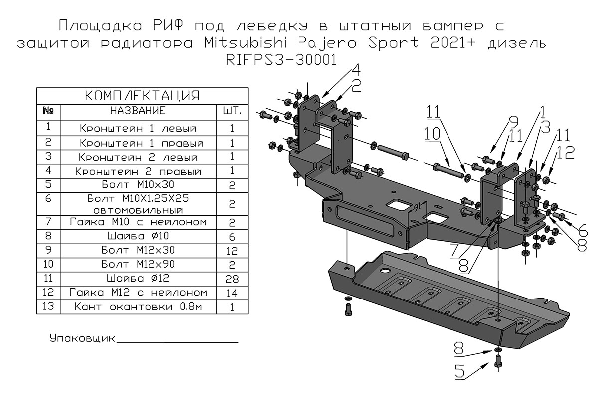 Данная площадка при установке не требует каких-либо сварочных работ. Бампер, подкрылки и фартук в нижней части машины крепятся на свои штатные места. Площадка предназначена для установки лебедки 8000-9500 lbs. Отличительной особенностью площадки РИФ является её особо прочная конструкция. Толщина металла - 6 мм.