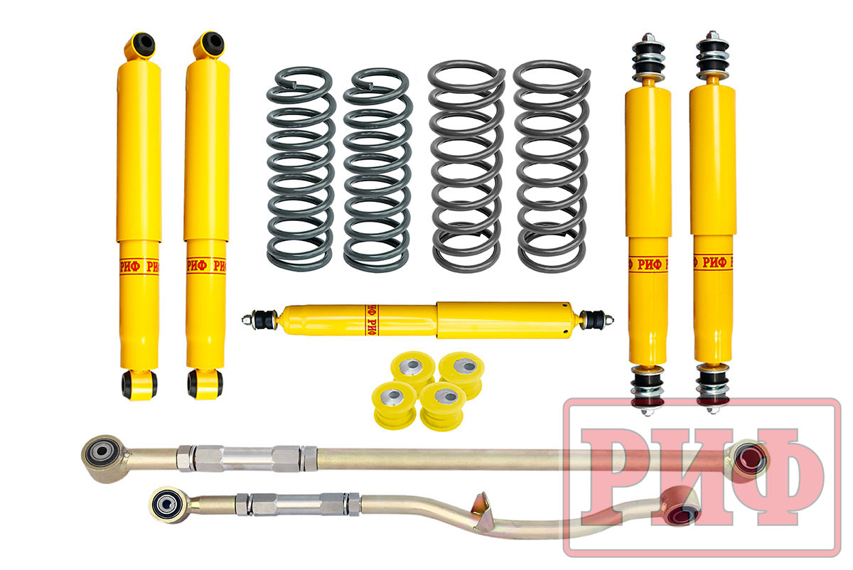 Все компоненты лифт-комплектов РИФ разработаны специально для эксплуатации внедорожника в тяжелых условиях на различных дорожных покрытиях. Рессоры, амортизаторы с технологией Foam Cell и пружины РИФ не только компенсируют вес установленного на внедорожнике дополнительного оборудования (бамперов, порогов, дополнительных топливных баков, лебедок и прочего), но также существенно повышают грузоподъемность автомобиля. Удлиненные стремянки и серьги РИФ произведены из высококачественных материалов и имеют увеличенный запас прочности. Рессорные втулки РИФ изготовлены из полиуретана обладает высокой упругостью, износостойкостью и термоустойчивостью к высоким или низким температурам.
