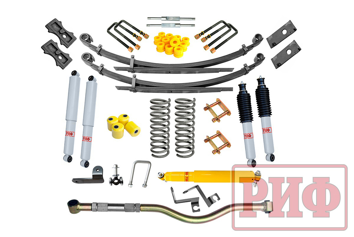 Все компоненты лифт-комплектов РИФ разработаны специально для эксплуатации внедорожника в тяжелых условиях на различных дорожных покрытиях. Рессоры, амортизаторы с технологией R-AIR и пружины РИФ не только компенсируют вес установленного на внедорожнике дополнительного оборудования (бамперов, порогов, дополнительных топливных баков, лебедок и прочего), но также существенно повышают грузоподъемность автомобиля. Стремянки и серьги РИФ произведены из высококачественных материалов и имеют увеличенный запас прочности. Рессорные втулки РИФ изготовлены из полиуретана обладает высокой упругостью, износостойкостью и термоустойчивостью к высоким или низким температурам.