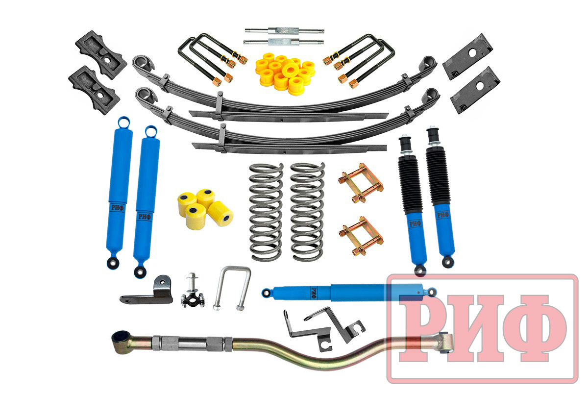 Все компоненты лифт-комплектов РИФ разработаны специально для эксплуатации внедорожника в тяжелых условиях на различных дорожных покрытиях. Амортизаторы с технологией R-AIR и пружины РИФ не только компенсируют вес установленного на внедорожнике дополнительного оборудования (бамперов, порогов, дополнительных топливных баков, лебедок и прочего), но также существенно повышают грузоподъемность автомобиля.