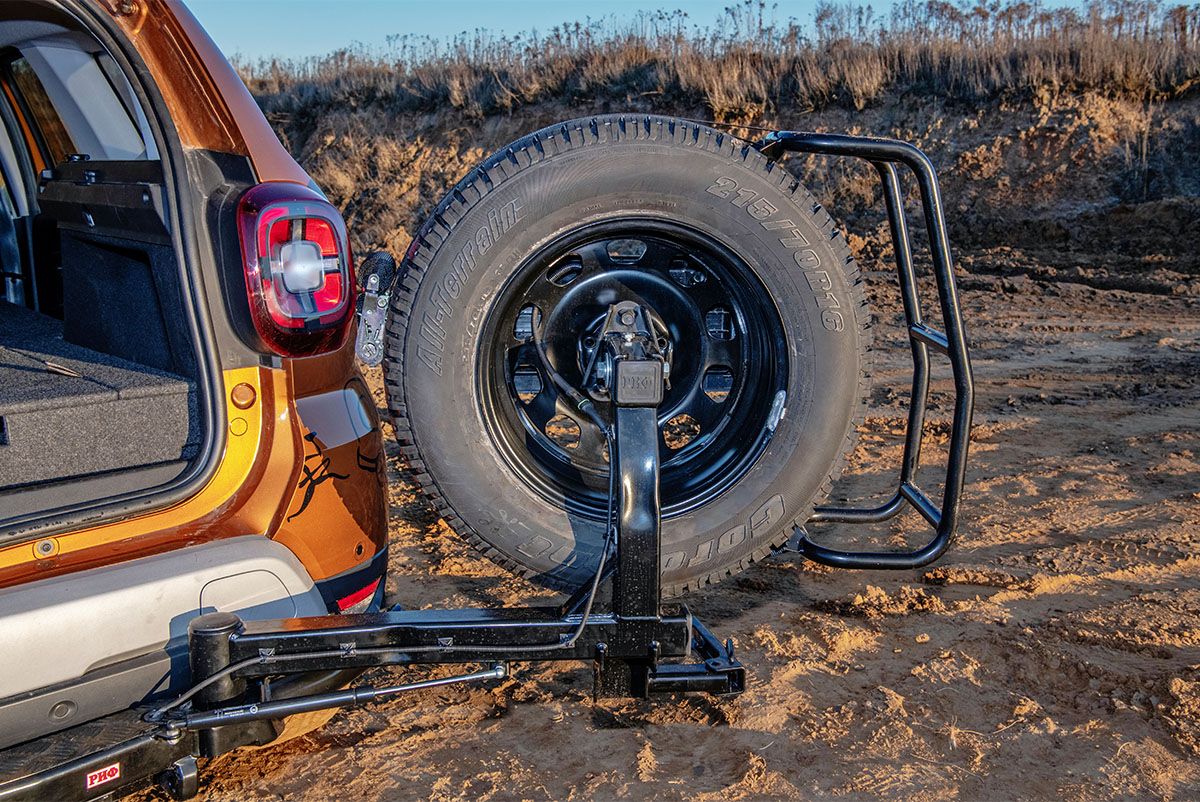Бампер оснащен мощной калиткой. Штатное место расположения запаски, под днищем, очень неудобно – она снижает проходимость, пачкается, на бездорожье ее не всегда возможно достать из-под машины. Кроме того, на штатное место не помещается колесо большого диаметра. Перевозка запасного колеса в салонном багажнике или на верхнем экспедиционном – это ограничение себя в объеме полезного багажа. Вывод – снаружи, на калитке. Тут и место для багажа не уменьшается, и доступ к запасному колесу всегда есть.