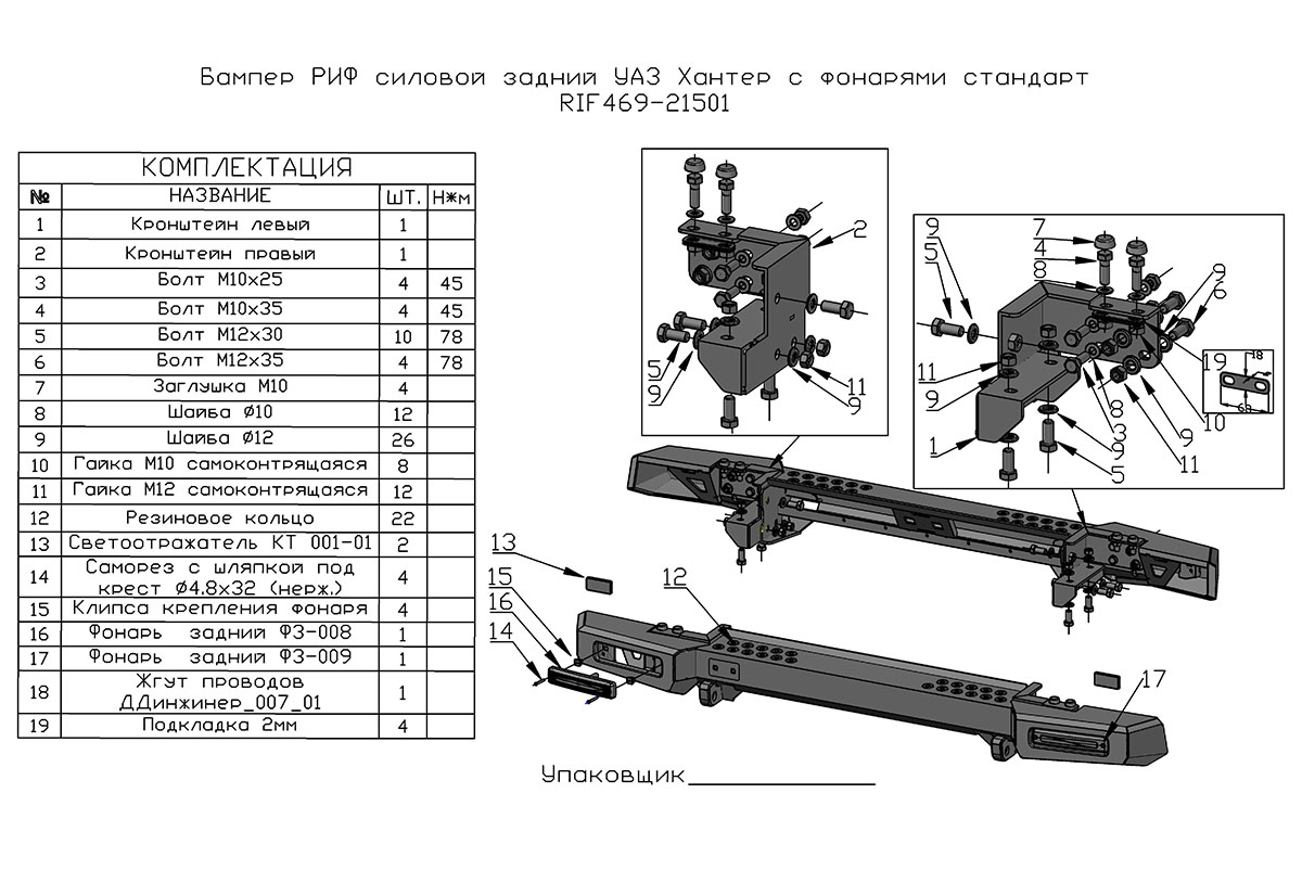 Бампер РИФ силовой задний УАЗ Хантер с фонарями, возможностью установки фаркопа, стандарт