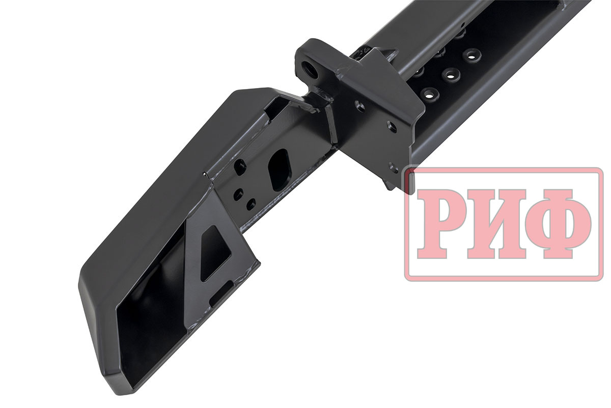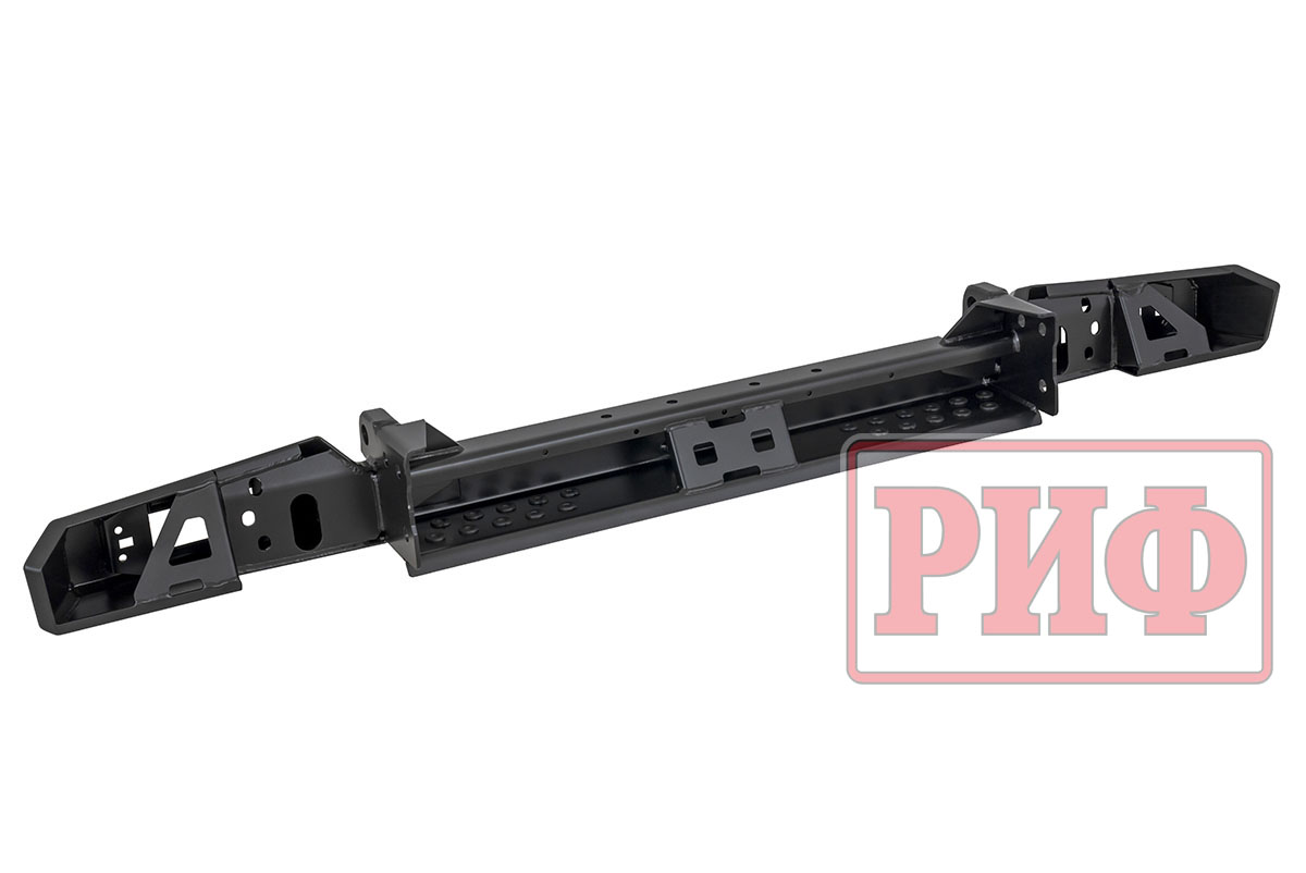 Задний силовой бампер РИФ надежно защитит кузов автомобиля на бездорожье или в городе в случае непредвиденных инцидентов. Бампер оборудован упорами под хай джек и буксирными проушинами для работы с рывковой или буксировочной стропой.
