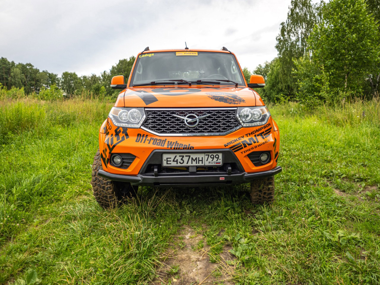 Мощные буксирные проушины крепятся к раме, одновременно выполняя роль установочных кронштейнов, поэтому при работе рывковым тросом или лебежении нагрузка будет передаваться не к бамперу, а сразу к раме автомобиля. Бампер очень красив и аккуратен, не сильно бросается в глаза на дороге. За бампер можно поднимать машину хай-джеком, для этого он оснащен усиленными упорами под реечный домкрат. Бампер можно установить с площадкой под лебедку РИФ в штатный бампер УАЗ Патриот (RIF060-30000). Для желающих использовать переносную лебедку, выпущен вариант бампера с квадратным разъемом под переноску.