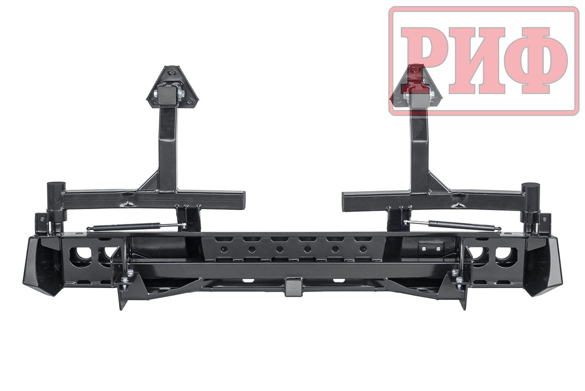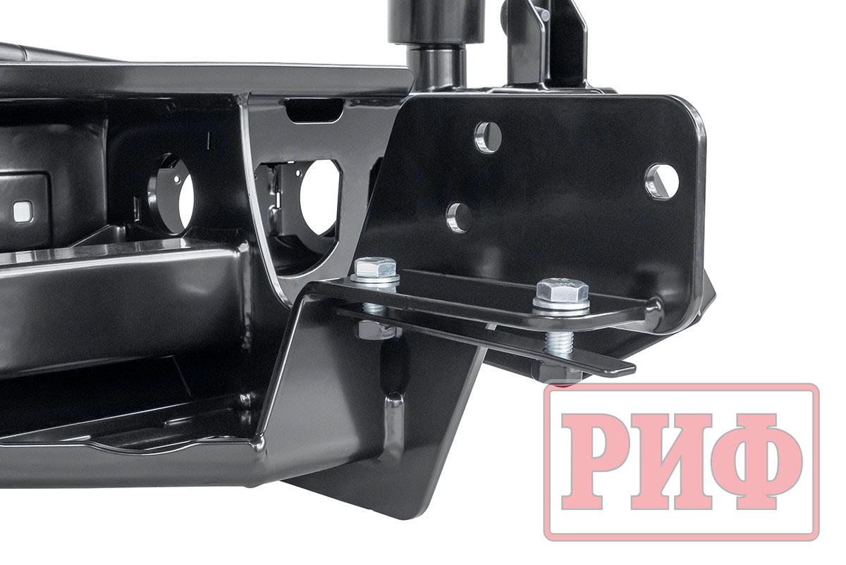 Бампер РИФ оборудован упорами под хай джек и мощными буксирными проушинами для работы с рывковой или буксировочной стропой, а калитка способна выдержать колесо любого размера и снабжена газовым упором, чтобы избежать случайного закрытия и нанесения травм. Фирменный замок калитки удобен для использования и не заедает даже будучи полностью в грязи и глине.