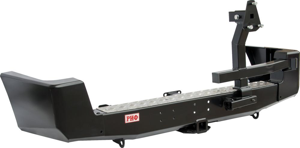 Задний силовой бампер РИФ надежно защитит кузов автомобиля на бездорожье или в городе в случае непредвиденных инцидентов. Бампер оборудован упорами под хай джек и буксирными проушинами для работы с рывковой или буксировочной стропой.