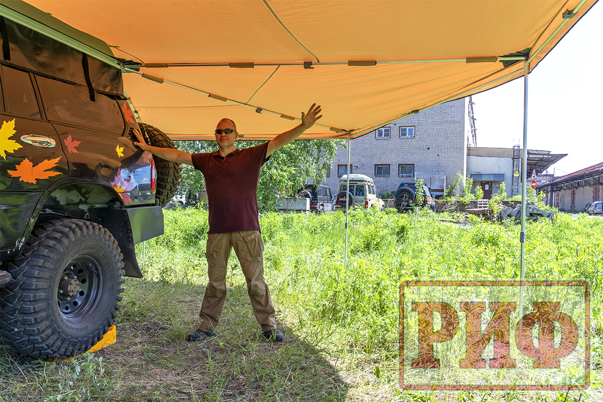 Комбинированная конструкция совмещает в себе простоту установки обычного тента-маркизы, но при этом дополнительно защищает подход к багажному отсеку, как у веерного. Размер тента в рабочем состоянии: 2,5 метра по стороне, которая крепится к автомобилю и 3,0 метра по вылету. Такой тент позволяет с комфортом разместить рядом с автомобилем 4-5 человек.