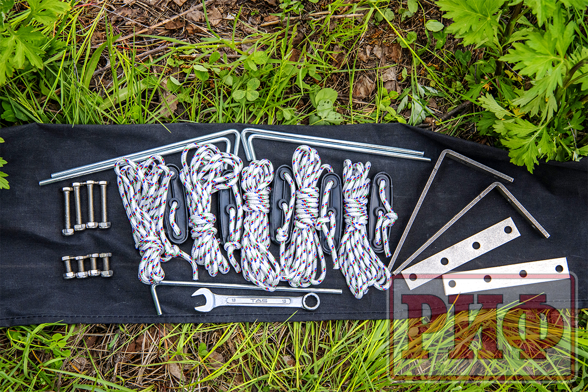 Установка тента под силу даже одному человеку и занимает не более двух-трех минут. В комплект входят веревочные растяжки с возможностью регулировки натяжения и металлические колья для крепления к грунту.