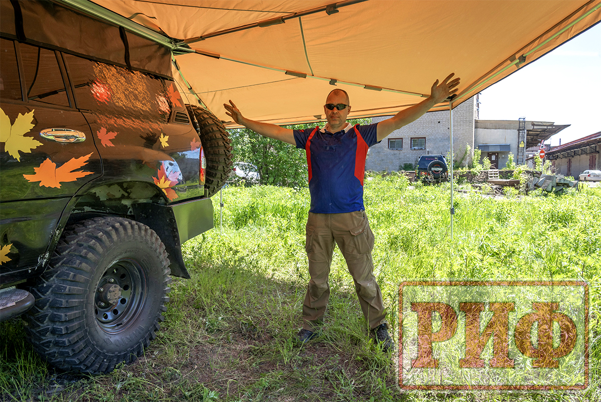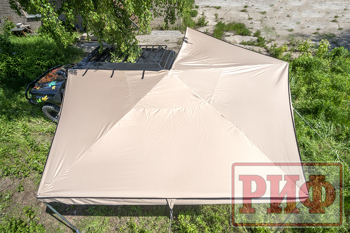 Размер тента в рабочем состоянии: 2,5 метра по стороне, которая крепится к автомобилю и 3 метра по вылету. Такой тент позволяет с комфортом разместить рядом с автомобилем 5-6 человек.