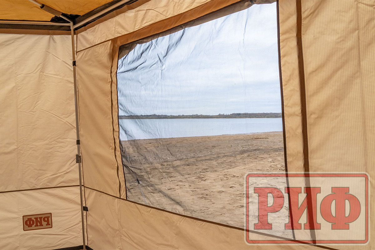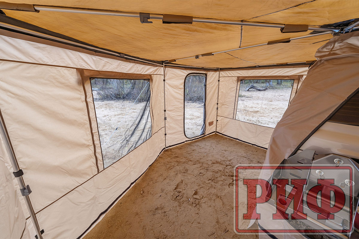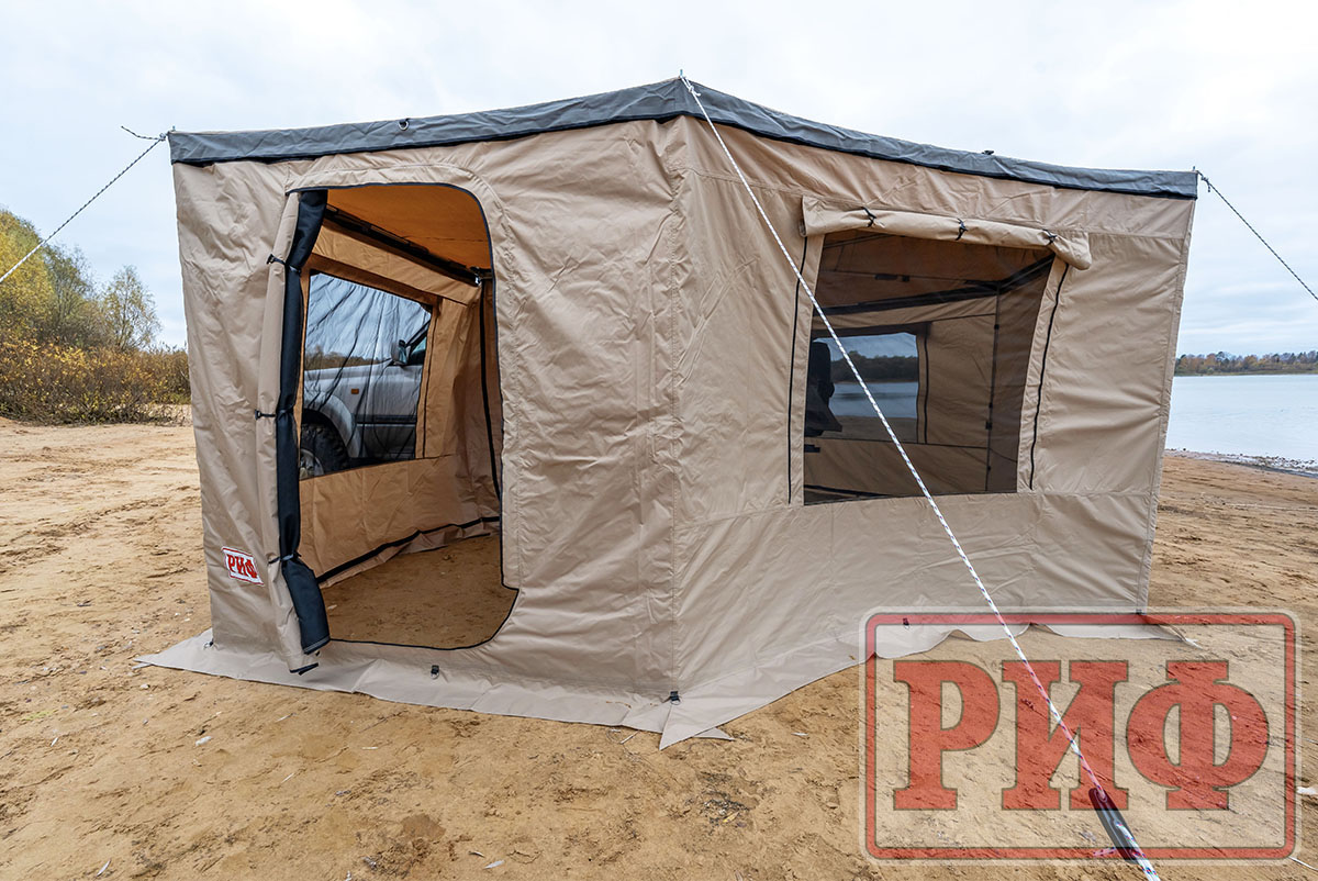На внутренней стенке есть огромный проем на молнии, позволяющий открыть боковую дверь автомобиля прямо из-под маркизы, не выходя под открытое небо.